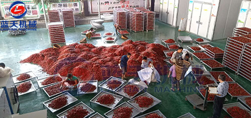 工人們在將辣椒攤放在辣椒烘干機的物料盤中
